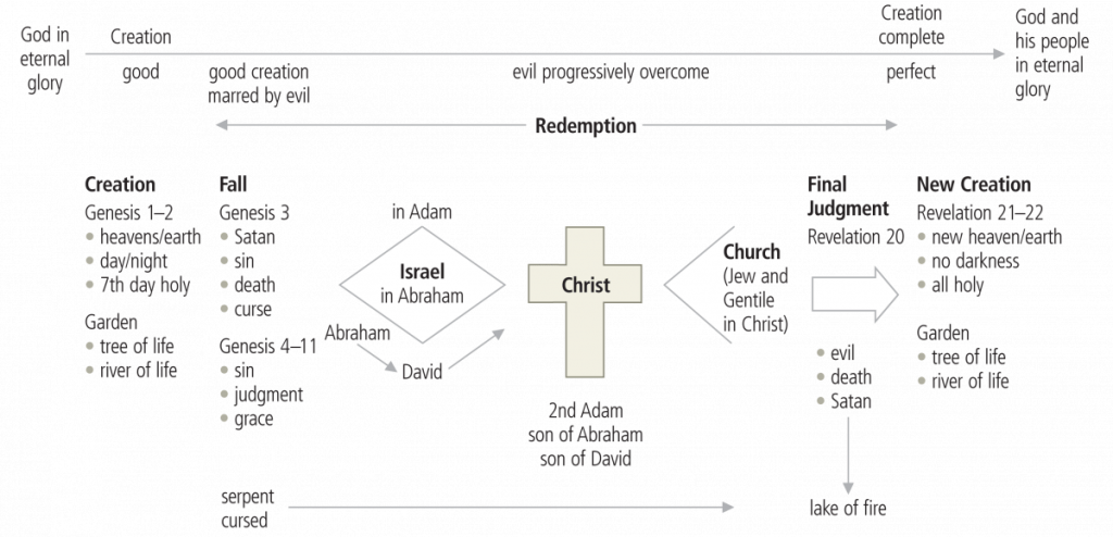 但新約聖經的最後一卷書卻描繪了一個異象,就是在人類歷史結束時,上帝的仇敵最終會被擊敗(啟十九~二十),上帝和「羔羊」(耶穌)在「新耶路撒冷城」作王,這新耶路撒冷城就是新天新地的一部分(啟廿一~廿二)。在這城裏有一道「生命水的河」和一棵「生命樹」(啟廿二1-2),這就讓人想起了創世記一開頭所描述的情形(創二8~14)。