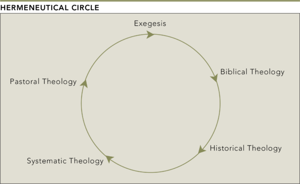 如果我們能把這些學科沿著一條直線排列,有人可能會認為很方便:Exegesis→BT→[HT]→ST→PT。(HT周圍的括號表明HT直接促進了從BT到ST和PT的發展,但本身並不是這條線的一部分)。但這種整齊的架構過於天真,因為任何解經都不是在真空中完成的。在我們開始做解經之前,我們已經有了一個影響我們解經的系統神學框架。那麼我們是否被鎖定在一個詮釋學的圈子裏呢?請看解經螺旋(Hermeneutical Circle)。