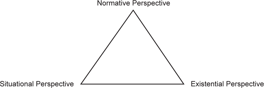 我在前面提到,世俗倫理學一般有三種類型:義務論、目的論和存在主義(deontologism, teleologism, and existentialism.)。這三派大體上對應於基督教思想的三種視角:義務論對應準則視角,目的論對應處境視角,存在主義對應。但是在基督教倫理學中,律法、處境和位格之間並不存在著張力,因為同一位上帝創造了這三者。上帝創造了人,讓他住在祂的世界裏,根據祂的準則生活。當我們在將上帝的倫理準則應用在我們自己身上、應用在我們的處境時,可能會面對困難,但我們不能責怪上帝所創造的世界。
