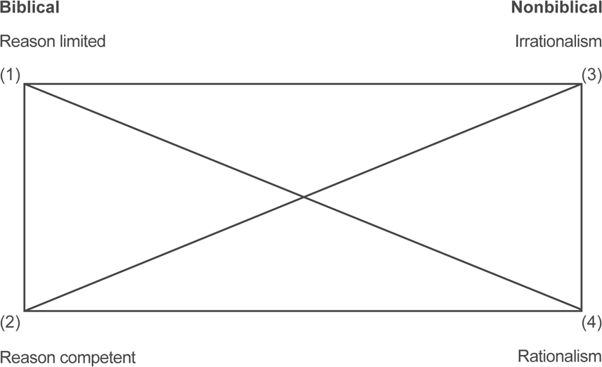 左上角的(1)告訴我們,因為上帝的超越性(祂是無所不知的),所有我們的理性是有限的。祂,而不是我們,是知識的終極掌控者和權威。我們的知識是我們作主門徒的一個層面,也就是說,是僕人所知道的知識(a servant knowledge)。我們的知識是服在上帝的掌控之下,上帝權威性的啟示為我們的思想設立了最高法則。(註腳43:在哲學界,人類思想的定律[laws of thought]一般是指邏輯學的基本定律,包括不矛盾定律[law of noncontradiction](沒有任何東西可以同時在同樣意義上既是A又不是A),同一律[law of identity](所有東西都是它所是的),以及排中律[law of the excluded middle](所有十五要麼是A要麼是非A;沒有任何東西可以同時在同樣意義上都是A與非A。我在這樣所要宣稱的是,上帝的啟示具有更高的權威,人類的邏輯系統也服在這個權威之下。)