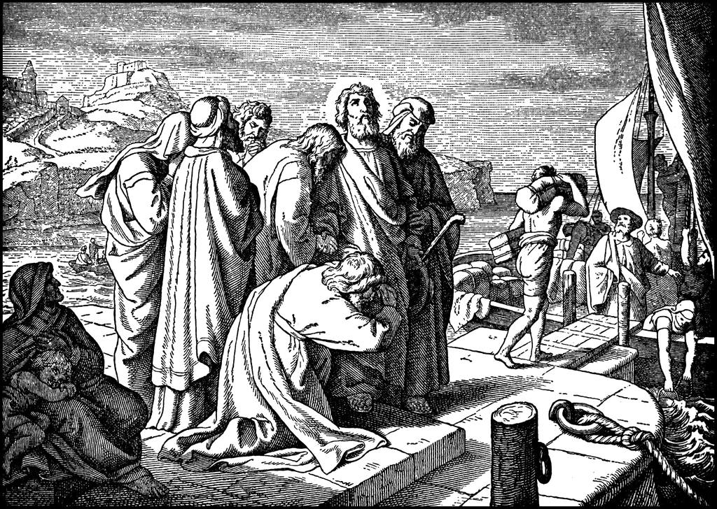20:36~21:16 保羅前往耶路撒冷的旅程。保羅先走海路,再轉陸路前往耶路撒冷。一路上,保羅悲傷地與各個教會逐一道別,他們都不約而同地警告保羅在耶路撒冷有危險。這使人想起耶穌前往耶路撒冷途中所發生的事情(見路13:33-35,18:31-33)。