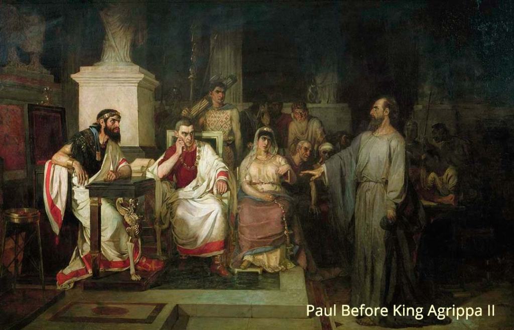 25:23~26:32 保羅在亞基帕二世面前為主作見證。保羅在盛大的場合中(25:23-27)向亞基帕王作見證(應驗了9:15的預言)。在保羅為自己辯護的三篇演講中(22、24、26章),在亞基帕王面前的這篇演講,對福音信息的闡述最為詳盡。