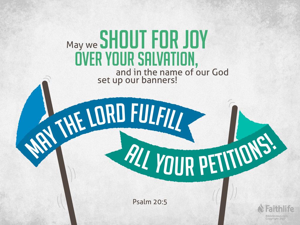20:1-5 祈求君王成功。會眾在禱告中向大衛家的君王(“你”)說話,祈求上帝答應他的禱告,保護他脫離仇敵、幫助他和支持他。將所有這一切稱為 “救恩”(5節),表明詩人承認這是來自上帝的賞賜,同時,這必定進一步實現上帝當初呼召祂百姓的目的;換言之,這並不表示百姓可以隨意貪婪地掠奪土地。