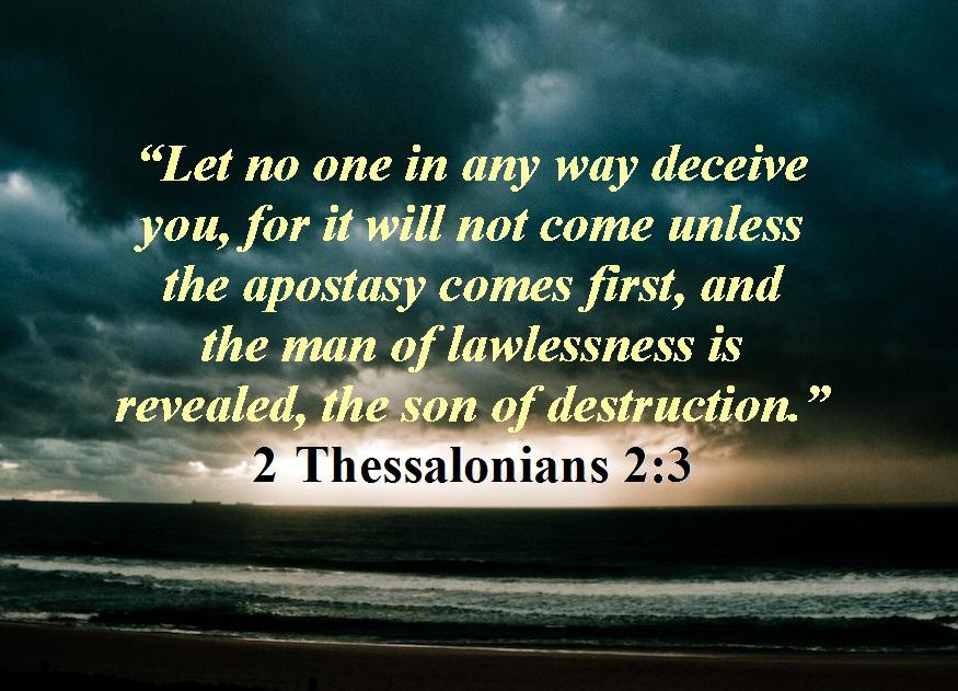 2:3 主的日子來臨之前會有兩個預兆,但這兩個預兆當時尚未出現。第一個預兆是必有離道反教的事。雖然有些解經家認為這是指基督徒或猶太人叛教的事,但根據9-12節,這裏很可能是指全人類對上帝的悖逆。就如全人類在亞當裏悖逆了上帝,結果深陷罪惡之中(羅1:18-32);同樣,那敵基督者出現的時候,人類也會肆意悖逆上帝(2:4)。第二個預兆是那大罪人(《和修》“那不法的人”)顯露出來。“大罪人” 在其他地方被稱為 “敵基督的”(見約壹2:18、22,4:3;約貳7節),他敵對上帝和上帝的啟示,最終要顯露自己的身份——叛逆者之首。他是沉淪之子,耶穌再來時必被擊敗和消滅(2:8)。