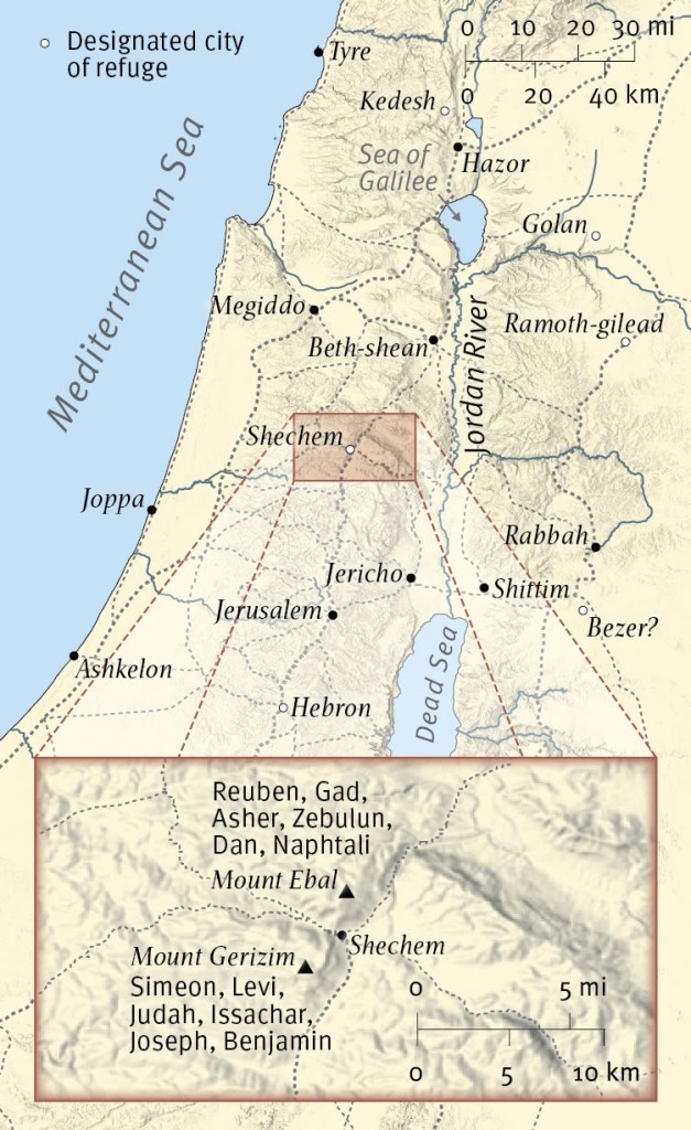 8:30-33 以巴路山和對面的基利心山(見申11:29),都位於艾城以北2公里,靠近示劍。自亞伯拉罕以來(創2:5-7,以及33:18和34:1-31中的雅各),示劍城就一直和以色列人的先祖有關聯。或許正是因為這種歷史淵源,以色列人可以不用先攻城,就在示劍重申並宣讀上帝與他們所立的聖約。這段經文中提到,在示劍聚集的這些人中,無論是本地人,是寄居的,可能表示一些示劍人已經自願加入以色列人當中(參出12:38。出埃及時許多 “閒雜人” 和以色列人一起離開,與這裏類似)。