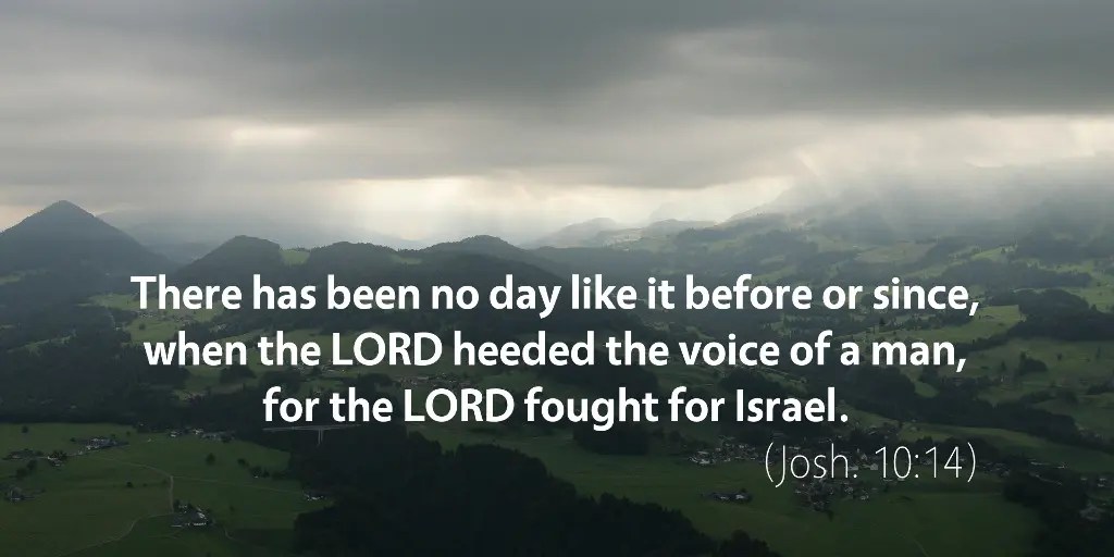10:1-15 日頭停止。在第10章中,以色列對其盟友基遍的威脅做出了回應(第1-9節),其衝突有三個描述:第12-15節、第16-27節和第28-43節。第一段(在第10-11節的總結之後)強調了上帝的援助。正如約書亞書中前面的神蹟一樣,上帝提供了所需的一切,而以色列人只需要走過這片土地(1:3)並取得勝利(16-43節)。(BTSB)
