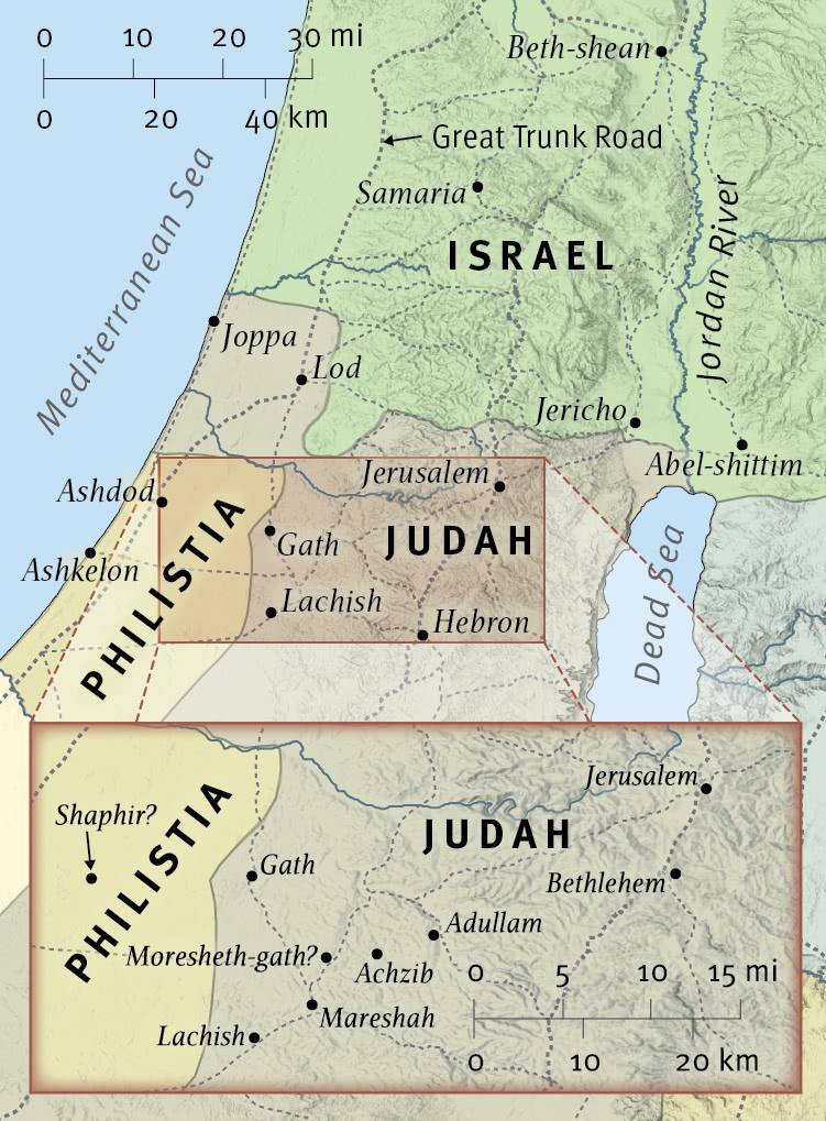 彌迦預言將有毀滅臨到耶路撒冷並護衛進城之路的城邑。雖然這些城邑位於耶路撒冷的西南面,但也處於北三方列強入侵時常經過的路線入侵的軍隊通常沿著南部的主幹道進城,直抵迦特。