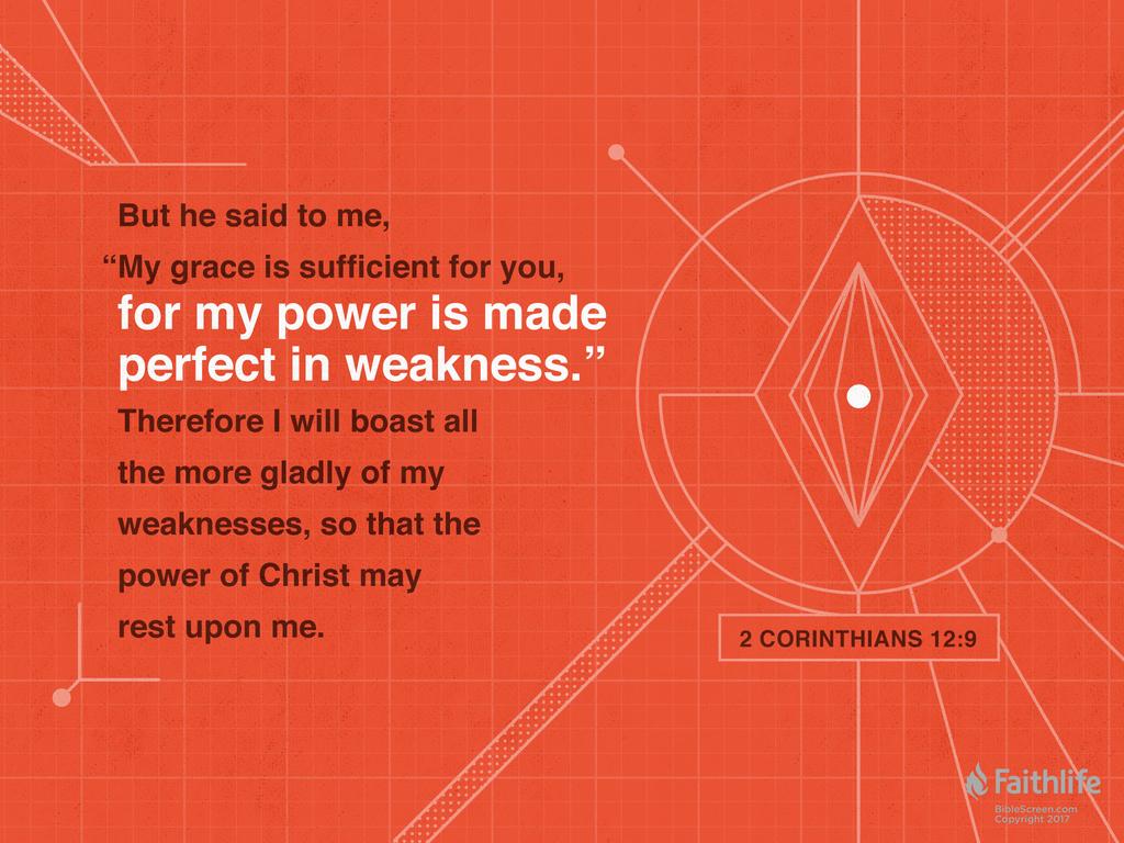 12:9-10 刺一直在,但保羅對上帝的答覆的回憶也是如此。在他的困頓在不同時期造成的令人痛苦的軟弱中,基督支持性的恩典(13:14)是夠用的,正是因為上帝的能力只有在人的軟弱中才能找到它全部的範圍和力量,也就是當基督徒承認,如果基督沒有加給能力,他們就無法有效地服事祂(參弗3:16;腓4:13)。但這並不是簡單地認為軟弱是能力的先決條件。在保羅的生活中,軟弱和能力同時存在(9b節,10b節;參4:10-11),正如它們在基督的職事和死亡中一樣。事實上,基督的十字架是“軟弱中的力量”的最高範例(第9節)。(BTSB)