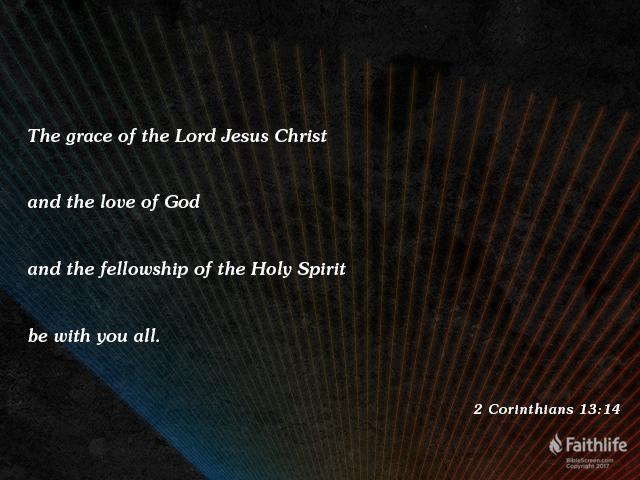 13:14 這是保羅書信中唯一一處提到三位一體的信末祝福。保羅強調恩惠、慈愛與信徒彼此間的感動(原文直譯:團契相交),是在基督裏藉著聖靈從上帝而來的。保羅在書信的最後提到聖靈,這使人想起他寫這封信和禱告的身份,是新的約的執事(見1:22,3:3-18,4:13-18,5:5)。你們眾人,保羅最後強調上帝親自帶來教會的複和與合一。促進合一是保羅寫這封信的一個主要目的(1:7,2:5-11,5:18-6:2,6:11-13,7:2-4,9:13-14,12:19,13:5-10)。