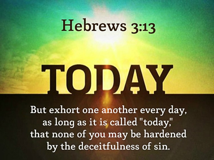 3:12-13 作者借用詩95篇中的幾個關鍵詞,警告讀者不可讓自己的心……剛硬,被罪迷惑,執意不信,使自己離棄(希臘原文apostēnai,“轉開,捨棄,脫離”;參路8:13;提前4:1)上帝。作者指出當中的危險,既鼓勵信徒持守信心(謹慎),也呼籲他們在教會中彼此鼓勵,同行天路(彼此相勸)。總要趁著還有今日,從上帝救贖計劃的角度看世界歷史,教會正處於特別時刻,主已經完成祂在地上的使命(包括降世、宣告福音和升天),現在信徒正等候主再來。在這樣的時刻,信徒需要有信心,彼此勸勉,持守並堅固信心。