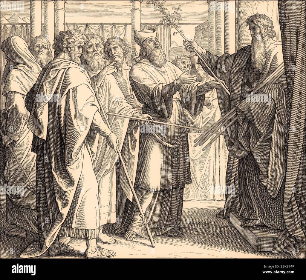 -在16章地裂,火,瘟疫惩罚可拉一党和流便支派的攻击摩西的人之后,神吩咐摩西要以色列每一个支派取一根杖放在会幕里一整夜,然后亚伦的杖发芽开花结果,神用这个神迹再次向以色列百姓显明,祭司的职位是祂选立的,百姓不可以挑战祭司的职份。