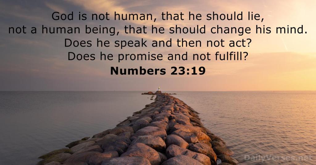 23:19 上帝非人,必不致說謊,巴蘭即使違背自己的私心,也必須說出上帝的話(參26節)。在此,他肯定上帝是真實守信的(參多1:2;來6:18),暗示上帝賜給以色列人的應許必會成就;上帝不會說謊,也不能說謊,因為這有違祂的本性。