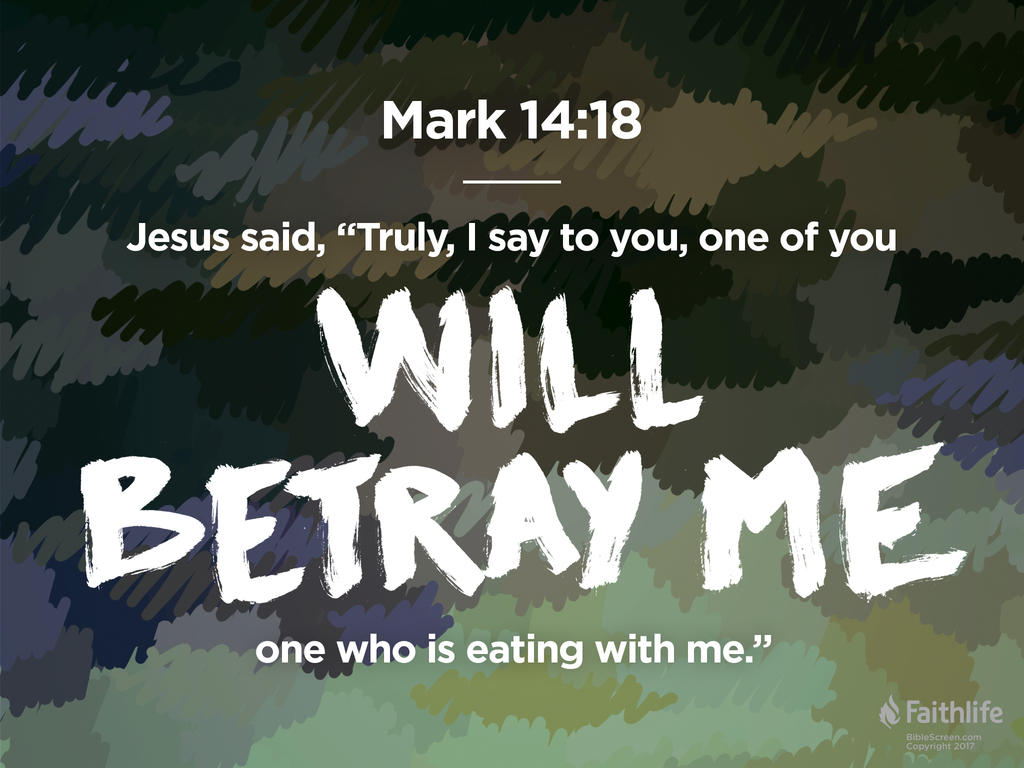 14:1-52 耶穌被出賣。耶穌被一個親密的同伴出賣了。逾越節的晚餐預告耶穌即將代替罪人受死。耶穌被捕是祂走向死亡的第一步。