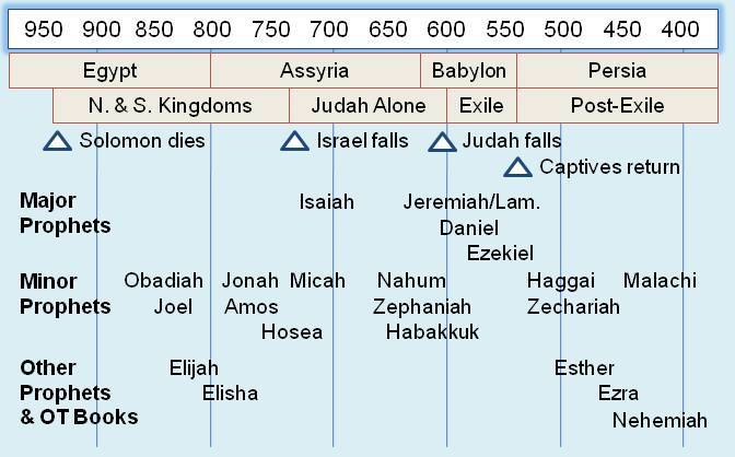 (二)以色列亡國後,猶大仍存:這時期的先知書包括耶利米書、耶利米哀歌、約珥書(這書的寫作日期未有定論)、那鴻書、哈巴谷書、西番雅書。這時亞述國势日衰,巴比倫漸漸取而代之,猶大在巴比倫的陰影下瑟縮求存。這時期的先知都強調審判迫在眉睫,只有那鴻例外,他預告亞述覆亡,使猶大得安慰,重拾倚靠上主之情。