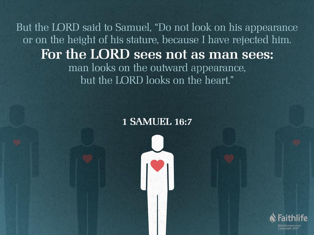 16:7 人是看外貌,耶和華是看內心,單從一個人的外貌,無法判斷他是否會忠心聽從上帝,因為人的行為是出自內心(參代下16:9;詩51:10;箴4:23;可7:21-23;路6:45;帖前2:4)。在《聖經》中, “心” 是指人裏面的道德和靈性生命,包含理性、意志和情感。