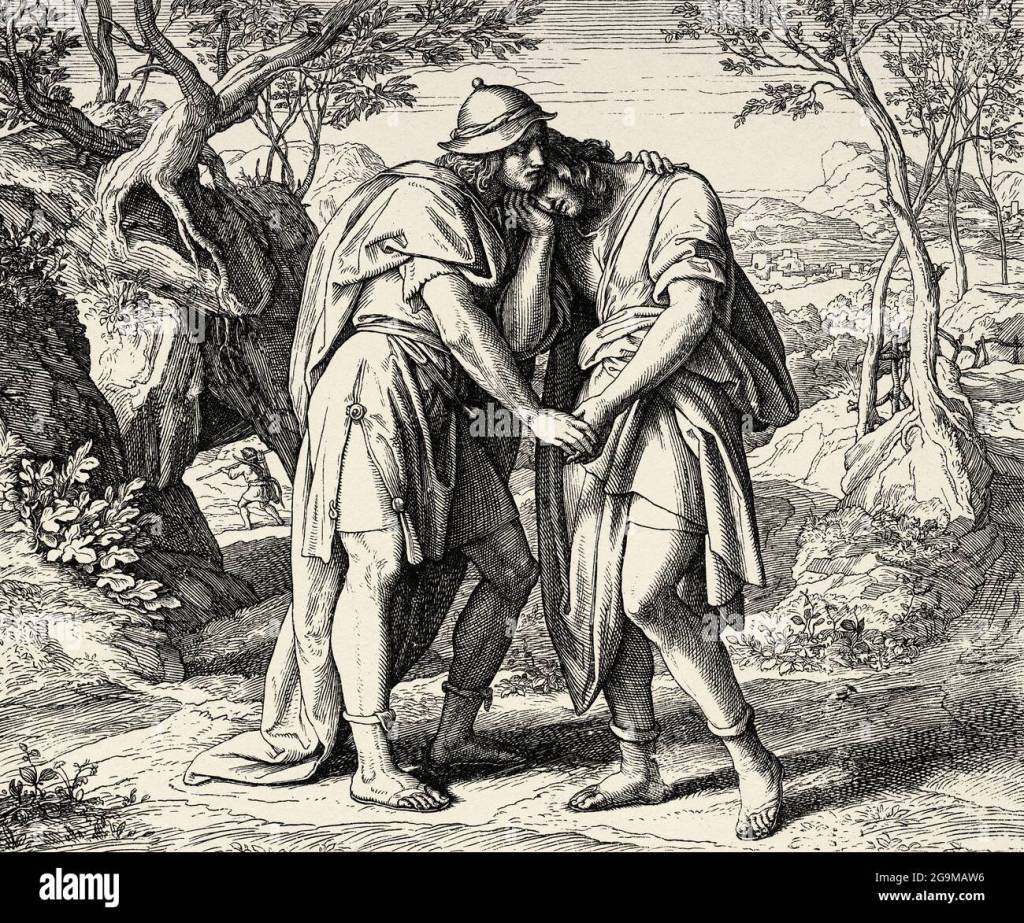 20:40-41 童子一去,約拿單已經事先安排好以箭為記(20-22節),免得大衛被發現。現在他覺得情況安全,就冒險去見大衛,親自與他道別。