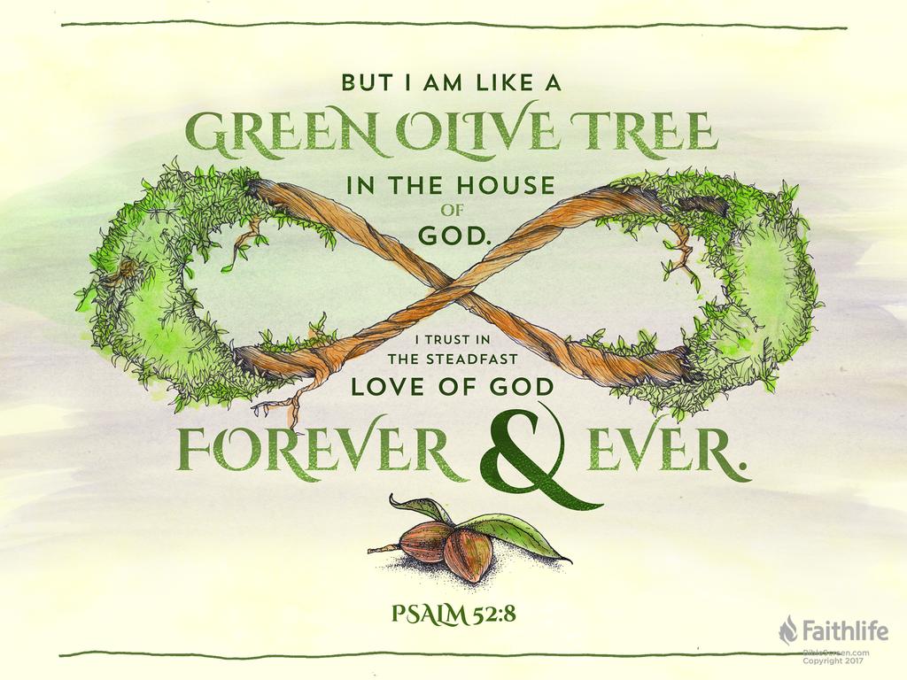 52:8-9 上帝啊,有你的保守,我是安全的。這個詩節更加充分地闡述第1節暗示的確信。與被連根 “拔出”(5節)的惡人不同,忠信人(聖民,9節)是青橄欖樹(充滿活力和果實累累,參耶11:16;何14:6;關於上帝殿中的香柏樹,參92:12-14)。關於上帝殿象徵上帝的善意,參23:6,27:4。與依靠雄厚財力的仇敵(52:7)不同,忠信人永永遠遠依靠上帝的慈愛(52:8)。上帝必會審判仇敵,這種預期讓忠信人堅定仰望上帝的,即上帝要透過保護那些依靠祂的人來維護祂的聖名。因此,忠信人不需要充滿復仇的怨氣。