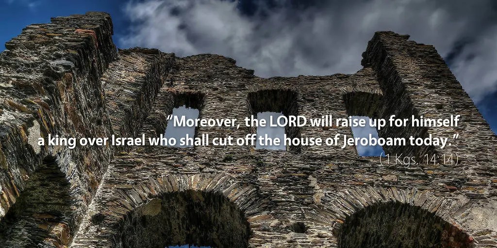 14:1-20 耶羅波安的結局。耶羅波安曾經得到上帝的應許,會像大衛一樣擁有王朝(11:38 “家”)。他也確實盼望有一座和大衛的殿一樣的殿(“家”),然而這盼望本身卻使他變得不順服,第13章已經啟示了他不順服的後果。這段經文描述耶羅波安蒙上帝應許賜他一個 “家”,他卻想要有兩個,因此導致淒慘的結果。