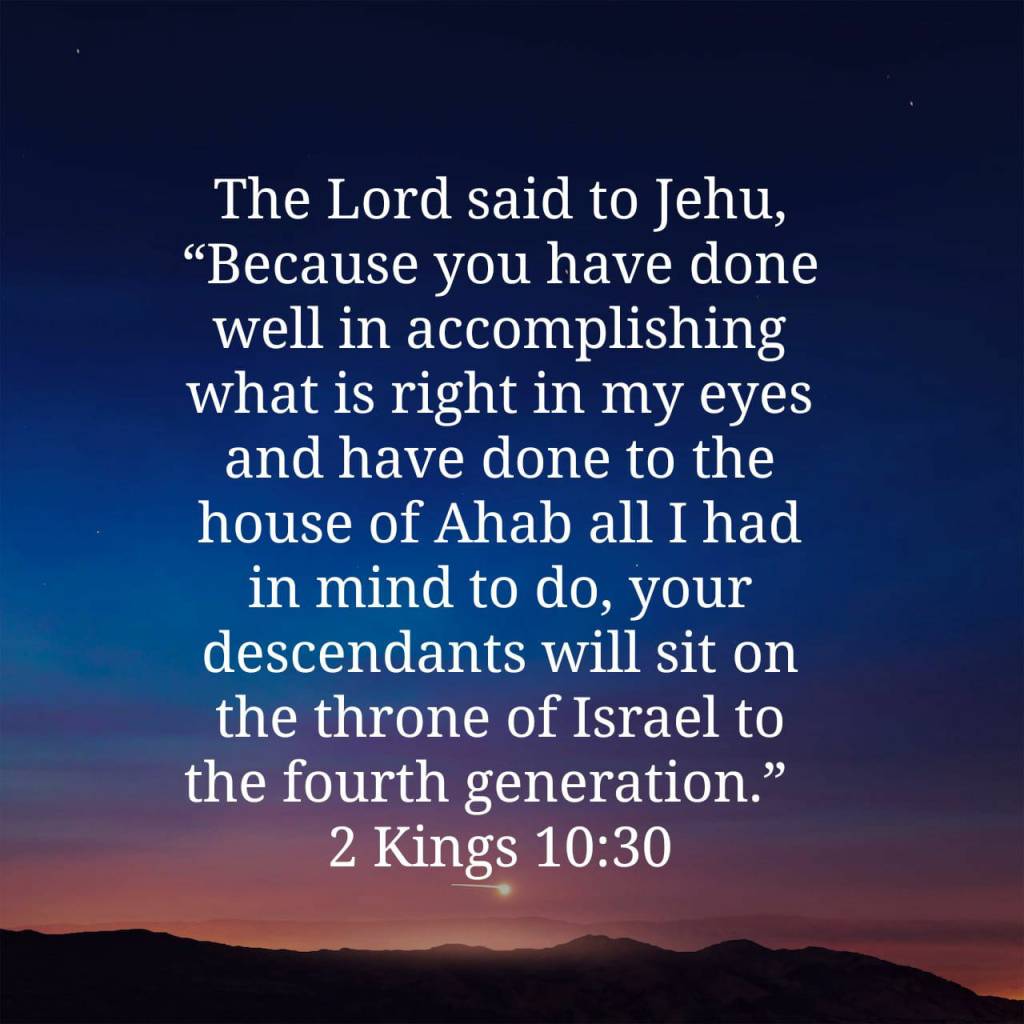 10:30 由於耶戶沒有廢除伯特利和但的金牛犢(29節;參31節),因此上帝說耶戶辦好了他中看為正的事(希伯來原文yashar),這令人感到驚訝。在《列王紀》的其他經文中,作者都是在肯定意義上使用yashar這個字,例如評價大衛(王上15:5)和猶大相對較好的(即不拜偶像的)君王(王上15:11,22:43;王下12:2,14:3,15:3、34,18:3,22:2)。更加令人驚奇的是,上帝像祂曾經應許大衛那樣,應許耶戶將擁有一個王朝。他的後裔必坐以色列的國位直到四代。雖然這不等同於應許賜下永久的王朝,但仍是非比尋常的;上帝應許耶羅波安,如果他行上帝眼中看為 “正的事”(王上11:38),那麼就賜給他像大衛家一樣的王朝,但最終他沒能做到,失去了這個機會(王上14:8)。顯然,耶戶所做正確的事(消滅巴力崇拜)其意義遠遠大於他現在和以後所做的錯事。