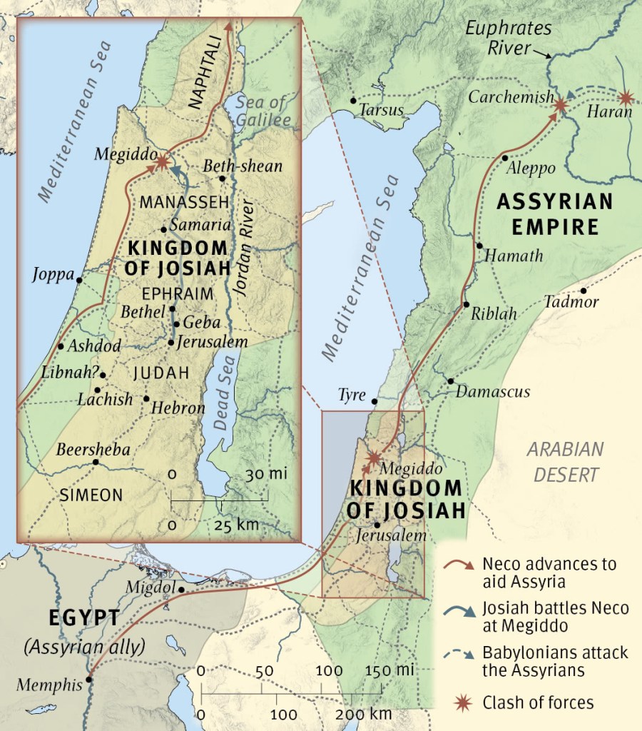23:28-30 埃及王法老尼哥……在米吉多……殺了他,亞述王亞述巴尼帕約在主前630年去世,之後埃及逐漸成為敍利亞巴勒斯坦地區的主要力量,並且在亞述與巴比倫的鬥爭中,做了亞述的盟友。從主前616年或更早開始,埃及就派兵北上,與亞述人並肩作戰。這裏提到的戰役發生在主前609年,法老尼哥二世向北進軍,顯然是最後一次亞述和埃及聯合對抗巴比倫(及其盟友瑪代)。米吉多控制著從埃及到大馬士革的主要國際通道,就是進入耶斯列平原的一段(見9:27-28注)。約西亞決定在那裏阻擋埃及軍隊,這意味著在這場戰事之前,他已從埃及或亞述的手中奪過米吉多,並且他可能希望被視為站在巴比倫一方而從中獲益。可是,約西亞戰死沙場。關於列王記,見王上14:19注。《巴比倫編年史》記載了埃及法老尼哥二世遠征來幫助亞述人,約西亞試圖阻止埃及增援亞述。在米吉多遺址可以看到這場戰役的證據。