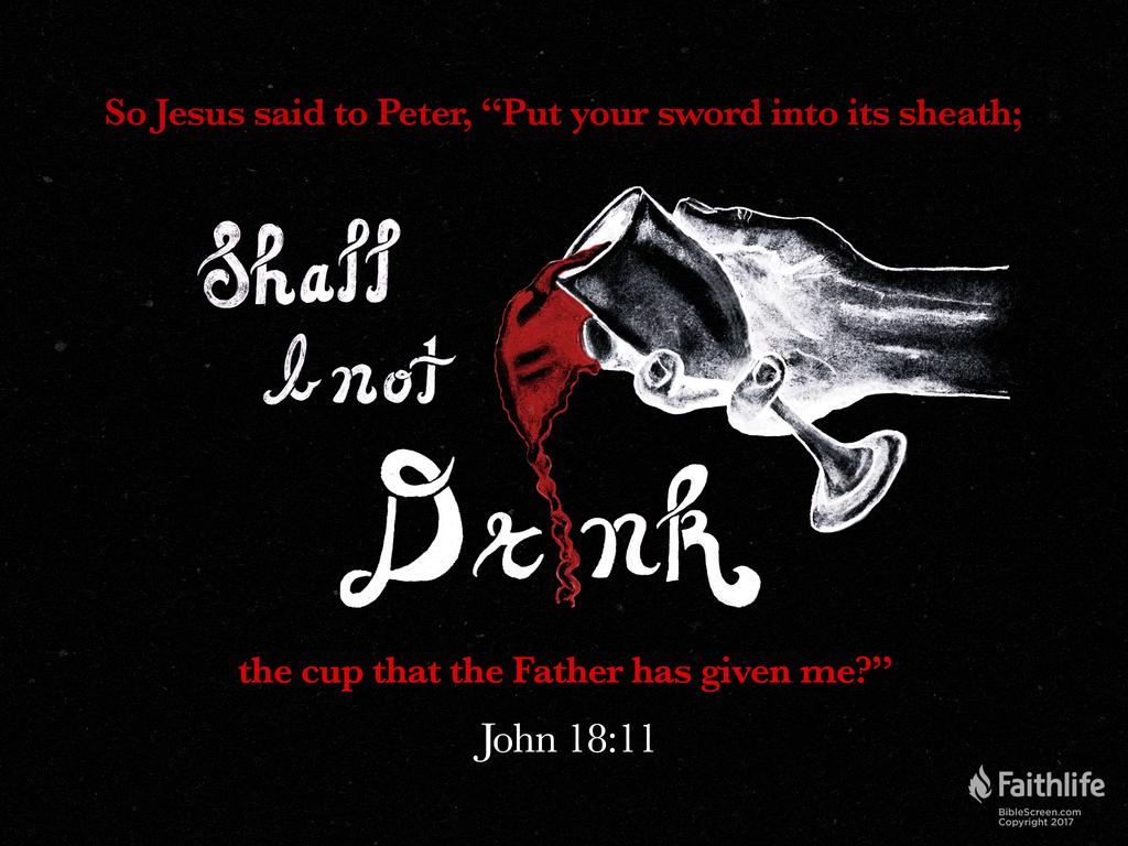 18:11 ……豈可不喝呢,暗喻死亡,象徵上帝的忿怒(見詩7:58;賽51:17,22;耶25:15-17、28-29,49:12;另見啟14:10,16:19)。耶穌的杯來自天父,因此祂準備喝這杯。耶穌在十字架上除了承受肉身的痛苦外,還承受上帝的忿怒傾倒在祂身上所帶來的極大痛苦。耶穌成為贖罪祭,償還罪的贖價(另見以下經文注釋:羅3:25;約壹2:2;參來2:17;約壹4:10)。