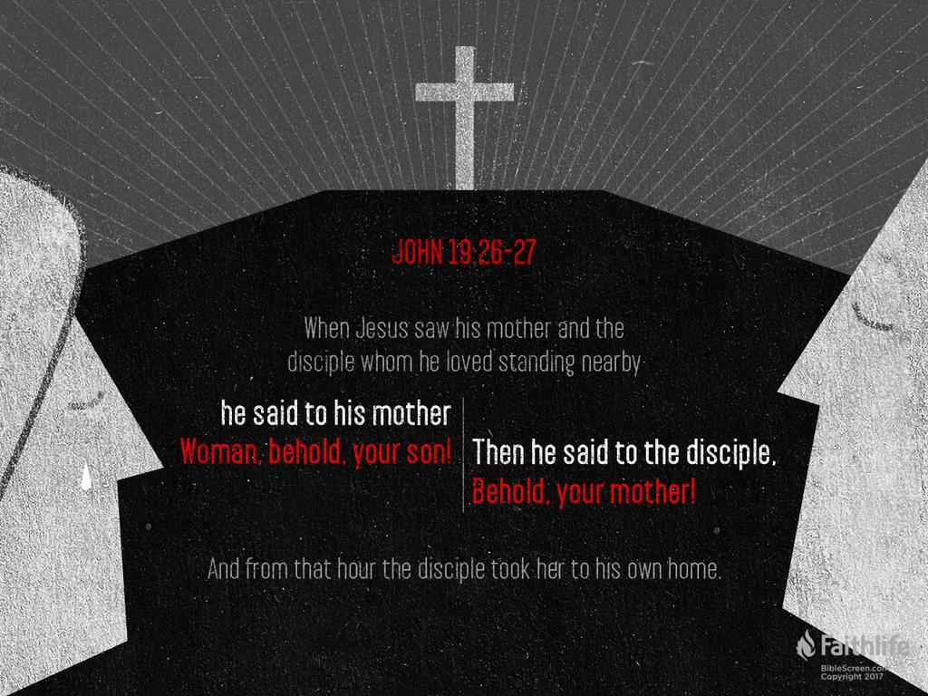 19:26-27 耶穌遵行《聖經》中關於孝敬父母的命令(出20:12;申5:16),安排母親得著奉養。幾乎可以肯定,祂的母親已經寡居,大概四十來歲或五十出頭,只有很少收人或幾乎沒有收入。關於婦人(見《和》注)這個稱呼,見約2:4注。