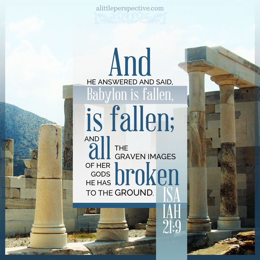 21:9 巴比倫傾倒了!傾倒了!重複呼喊,強調巴比倫最終並徹底地被毀滅(參啟14:8,18:2)。他……的神代表一種賦予巴比倫正統地位的世界觀。因此,世界最受重視的信念被打碎了。