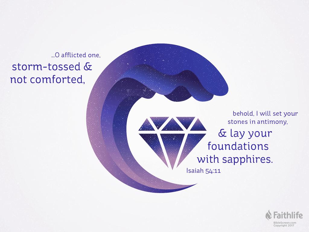 54:11-12 上帝的百姓經歷了巨大的痛苦之後,必定得到復興,像一座廢棄的城邑用最好的材料來重建一樣。我(《和修》“看哪,我”),只有上帝能使祂的百姓得榮耀。