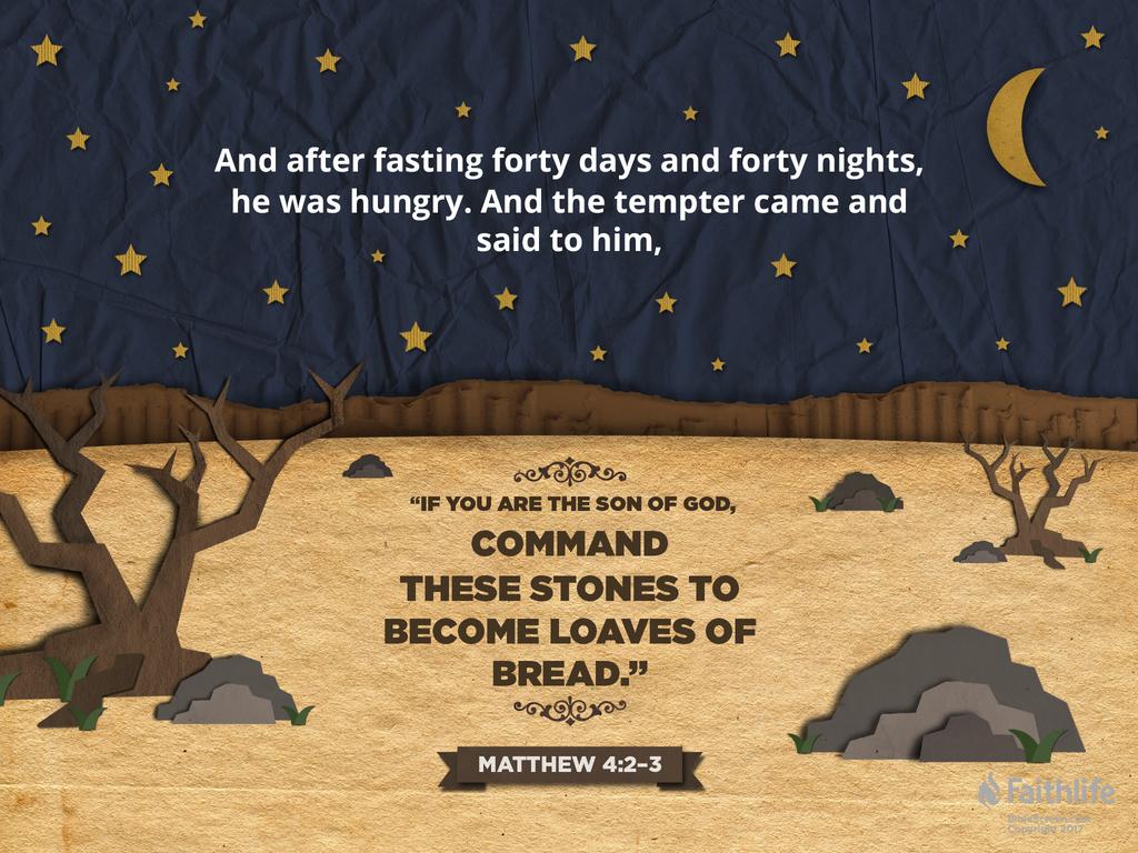 4:2-4 三個試探中的第一個試探,是訴諸耶穌四十天沒吃東西後的強烈饑餓感。但耶穌決不可為自私的理由而使用祂行神蹟的能力。上帝會支持祂,屬靈的滋養要優先於肉體的供養(申8:3)。(BTSB)