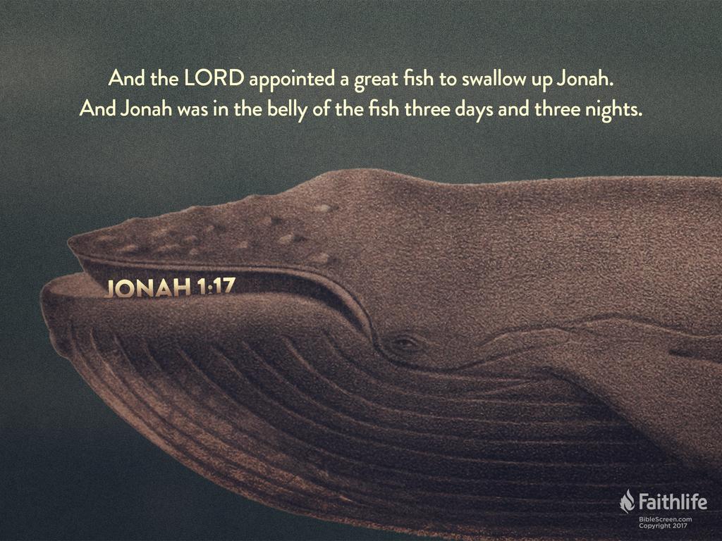 1:17 安排,強調上帝掌管受造物的至高主權(參4:6-8),“安排”在本書共出現四次,這裏是第一次。“魚”(希伯來原文dag)並不限於指我們今天所稱的“魚”(通常指海中有鰭和鰓的冷血脊椎動物),而是泛指水生動物,但無法確知它具體所指。然而,大型鯨類如抹香鯨,可以輕鬆地吞下一個人。三日三夜,雖然可能象徵死亡和復活的時間(參何6:2),但根據當時通行的日期計算方法,這個表述更可能是指實際天數,或者三天中的部分時間(參撒上30:12;王下20:5、8)。無論哪一種情況,“三日三夜”都是指從已死或瀕死狀態中復活,這也可能是耶穌把自己的死和復活,與約拿在魚腹中的時間相提並論的原因(太12:40)。