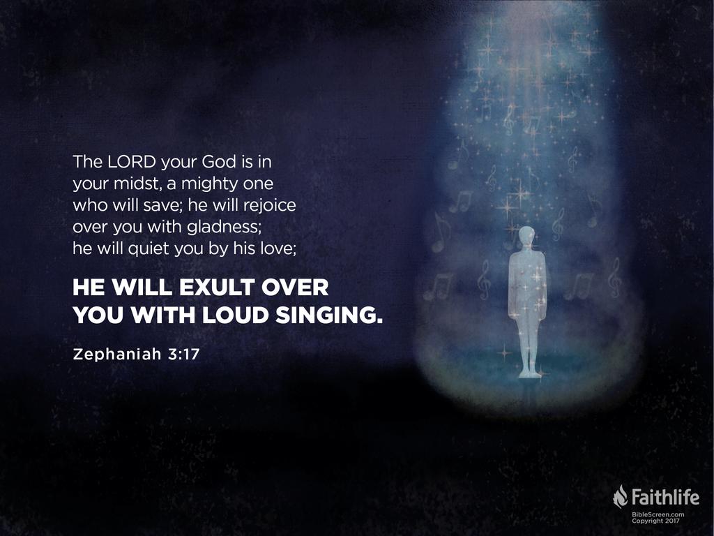 3:17 過去軟弱的國家,現在有大有能力的主(申10:17;詩24:8;賽10:21,42:13),就是上帝自己,與他們同在。上帝不像世上的勇士和英雄(1:14),祂不會喪膽。上帝不會在危險面前逃跑,卻要拯救祂的百姓脫離危險(出14:30)。本節也特別指出,上帝自己必因你歡欣喜樂。上帝的百姓若是尋求祂、跟隨祂(3:12-13),在祂裏面歡喜快樂並信靠祂(14-16節),上帝就會因他們而喜悅。上帝的喜悅,不是淡漠而不帶感情地表示滿意,而是會進發出頌讚上帝的歡樂頌歌:且因你喜樂而歡呼。