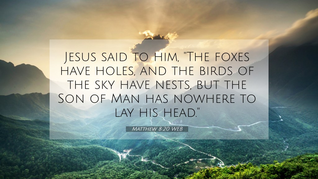 8:20 人子(見約1:51注;參但7:13)是耶穌最喜歡的自稱,表明了祂身份和傳道事工的真正含義:(1) 祂是謙卑的僕人,祂來為要赦免人的罪(參太9:6);(2) 祂是受苦的僕人,將藉著代贖的死和復活來救贖祂的百姓(16:13、27-28);(3) 祂是榮耀的君王和審判者,將要再來,在地上建立上帝的國度(25:31,26:64)。沒有枕頭的地方,信徒可以預期,他們也會遭遇與耶穌類似的經歷(約15:18;參16:33),基督徒的生活不都是安逸和舒適的。