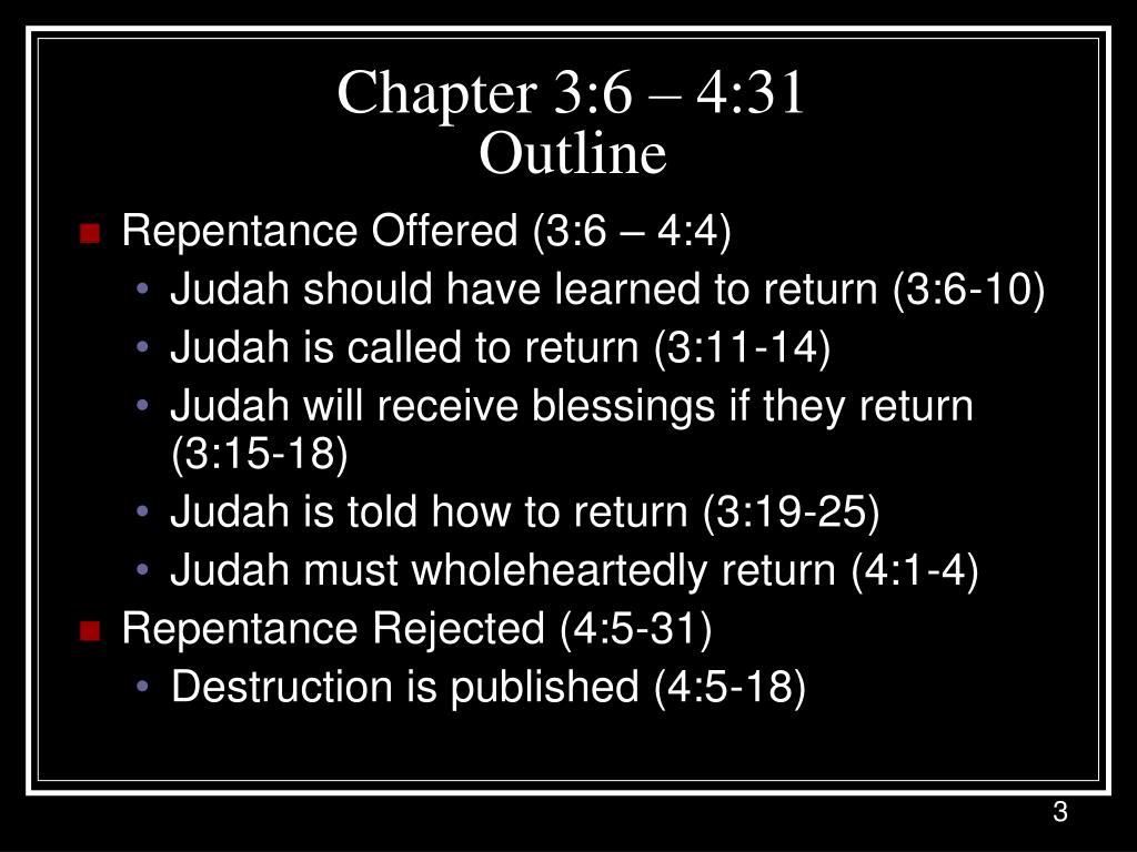 3:7 儘管上帝幾百年來對以色列多番忍耐,她卻不歸向上帝。“歸向”(希伯來文shub)可以譯作“歸回”或“悔改”,根據上下文而定。以色列不“歸回”,就是拒絕“悔改”。令人傷心的是,她奸詐的妹妹猶大也仿效她的行為。