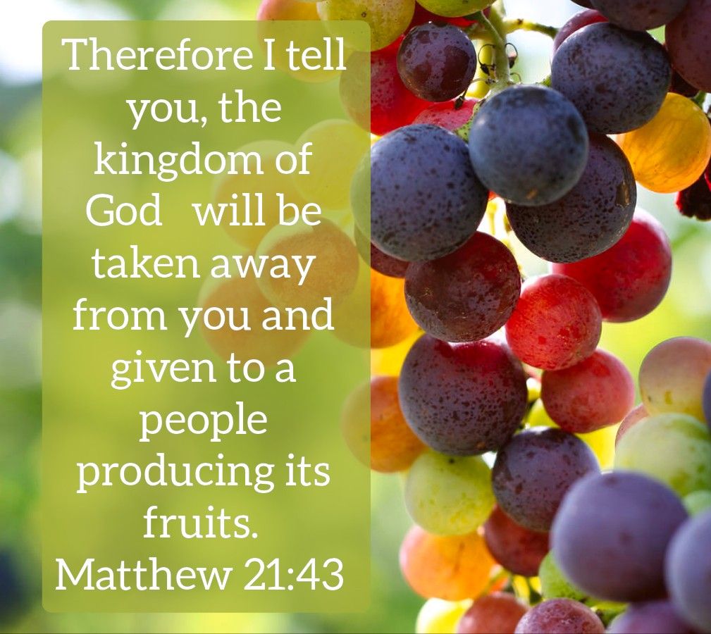 21:43 上帝的國必從你們奪去,宗教領袖沒有履行上帝託付給他們的職責,他們不單個人生活失敗,也未能帶領好以色列民。他們本來有權照看上帝的葡萄園(國度),但如今這權利要被奪去,賜給那能結果子的百姓。由門徒組成的教會就是這群新的 “百姓”(希臘原文ethnos,“國民,子民”),其中有猶太人,也有來自“萬民”(28:19;希臘原文ethnos的複數形式)的外邦人。隨著上帝的國度在今世擴展,我們會看到這些人被招聚一起,組成一個新的 “國度”(彼前2:9;希臘原文ethnos的單數形式)。