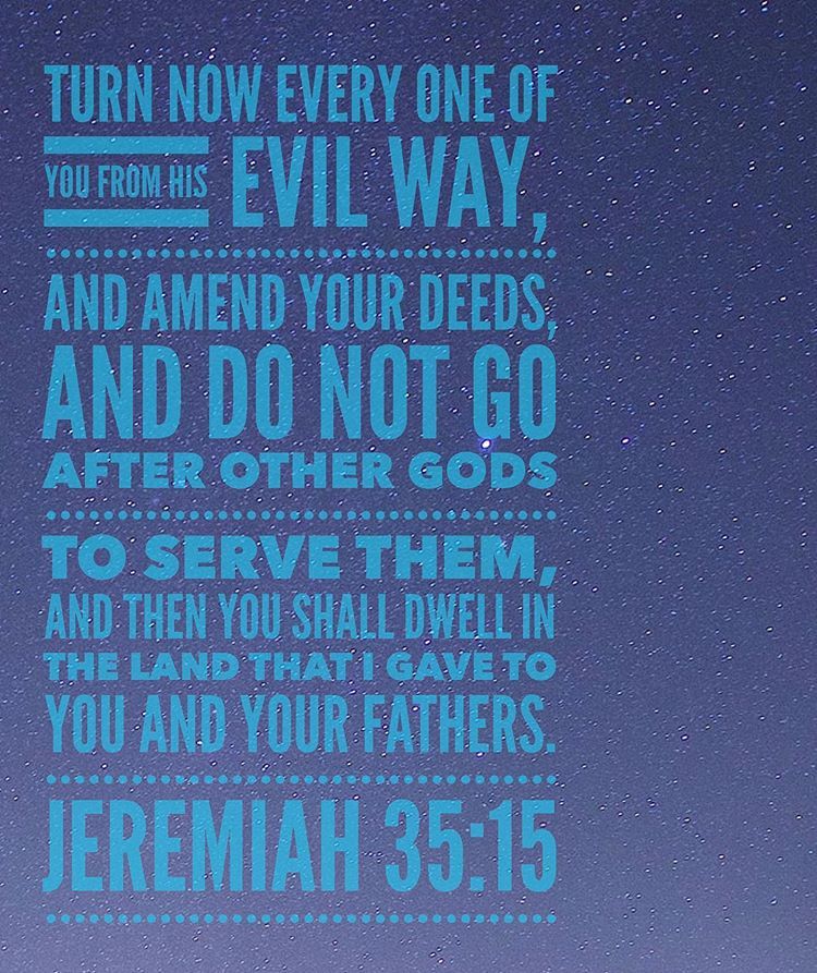 Jer 25:3-7 「從猶大王亞們的兒子約西亞十三年直到今日,這二十三年之內,常有耶和華的話臨到我;我也對你們傳說,就是從早起來傳說,只是你們沒有聽從。 (4) 耶和華也從早起來,差遣他的僕人眾先知到你們這裡來(只是你們沒有聽從,也沒有側耳而聽), (5) 說:『你們各人當回頭,離開惡道和所作的惡,便可居住耶和華古時所賜給你們和你們列祖之地,直到永遠。 (6) 不可隨從別神事奉敬拜,以你們手所做的惹我發怒;這樣,我就不加害與你們。 (7) 然而你們沒有聽從我,竟以手所做的惹我發怒,陷害自己。這是耶和華說的。』」