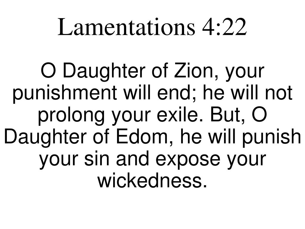4:22 受足了(《和修》“已經結束”),表明猶太人所受的刑罰已經結束,生活、敬拜、社會秩序等將要恢復,儘管這個過程漫長、艱難而緩慢。必不使你再被擄去,在主前538—主前535年,猶太人開始歸回猶大地(參拉1:1~2:70;耶29:10-14;但9:1-2)。以東,見耶49:7-22;哀4:21。