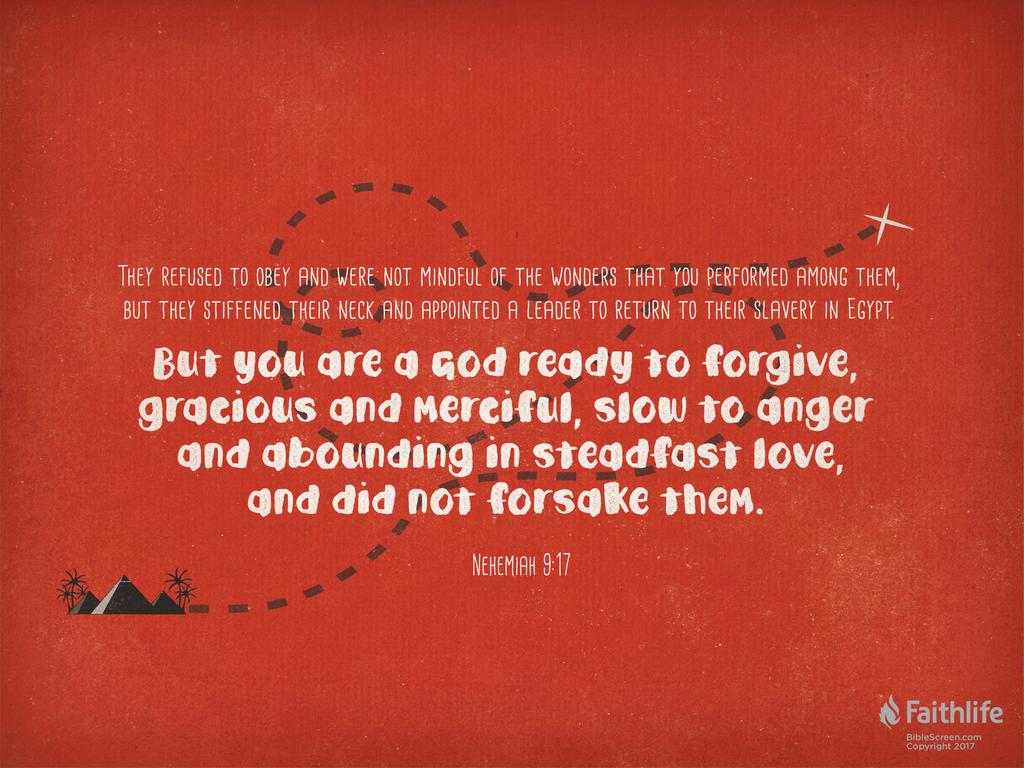 9:16-18 以色列人經常背叛上帝,因而必須依靠上帝的恩典(見申9:4-6)。自立首領,見民14:4,百姓必定曾經著手選擇另一位領袖,儘管民14章沒有記錄實際的任命。牛犢,上帝和摩西還在西奈山上立約時,以色列人正在犯背道的罪(出32章;申9:7-21)。然而,上帝樂意饒恕人,有恩典,有憐憫(9:17),見出34:6-7。儘管以色列人犯了罪,但上帝馬上重造法版,與百姓重新立約,並應許祂會繼續與以色列人同在。