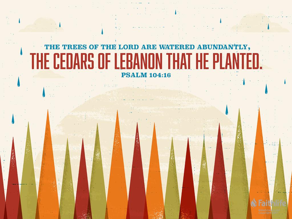 104:14-18 上帝為陸上動物提供食物和居所。一提到水,人們就自然會想到菜蔬的生長(第三日創造的第二個部分;創1:11-12):菜蔬、葡萄(釀)、橄欖(榨)和(做餅)等,以及各種各樣的樹木。104:14-15著眼於田園中的出產(六畜和地裏所出的食物),而16-18節和10-13節則關注野生環境,如野山羊所居之地。上帝的看顧延伸至不潔淨的動物,例如(利11:19;申14:18)和沙番(或蹄兔,利11:5;申14:7;見箴30:24-28注)。上帝看顧各種各類的動物,包括那些祂禁止以色列人吃的動物。