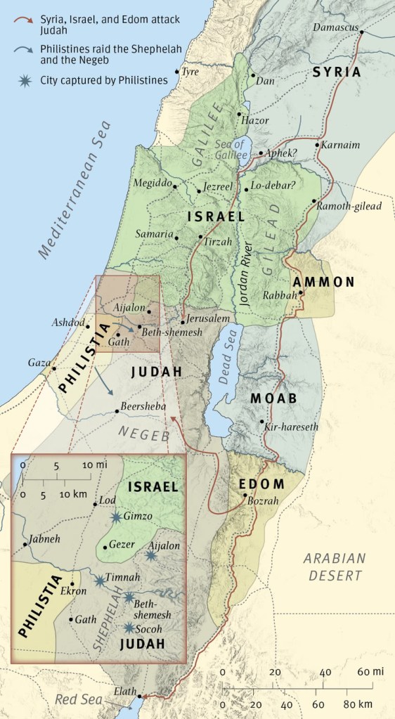 亞述帝國向西擴張,亞蘭和以色列試圖強迫猶大和其他鄰國組成反亞述聯盟。猶大拒絕加入,於是亞蘭和以色列聯合攻打耶路撒冷。亞蘭奪取了猶大的以拉他,轉送給以東。以東此時可能也突襲了猶大,俘虜了一些百姓(見代下28:17)。非利士可能加入了反亞述聯盟,也出兵攻打猶大,佔領了高原謝非拉和南地尼革夫的幾座城邑(見代下28:18)。