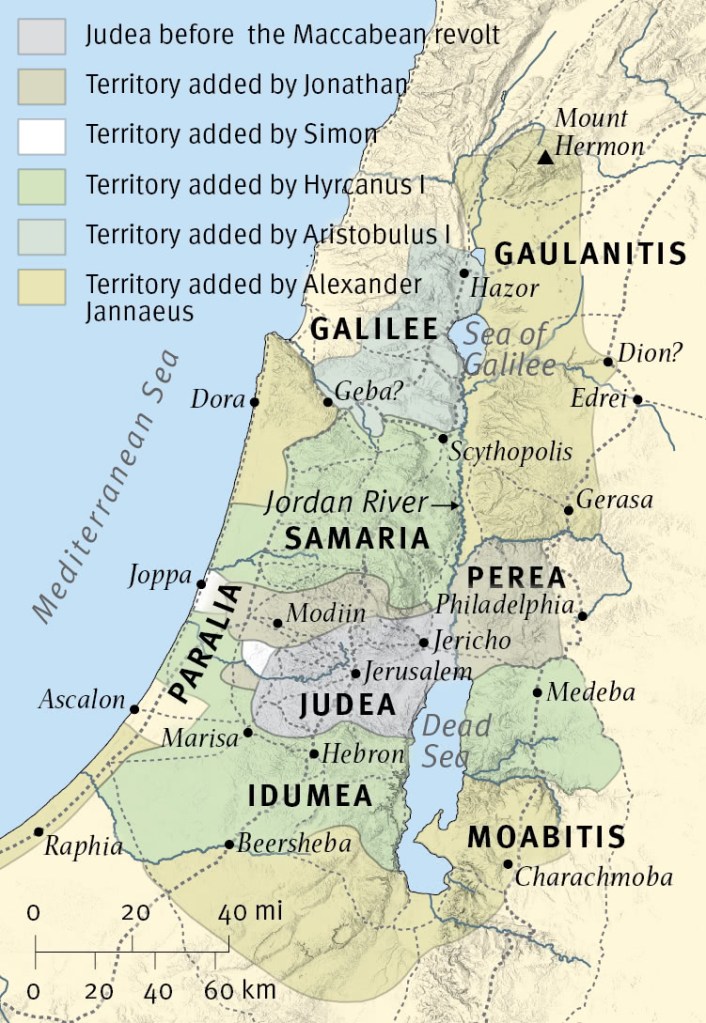 哈斯摩尼(馬加比)王朝(主前168-63[37]年):現在,學者普遍認為“哈斯摩尼”這個名字是源於一個地名,可能是黑實門或哈摩拿。然而,猶太歷史學家約瑟夫說,“哈希曼”(希臘文是Asamōnaios;見約瑟夫《猶太古史》12.265),是瑪他提亞曾祖父的本名,可見那才是“哈斯摩尼”一名的真正來源。瑪他提亞生了五個兒子,按長幼順序是:約翰(又名迦底)、西門(稱為太西)、猶大(稱為馬加比)、以利亞撒(稱為亞冉)、約拿單(稱為阿弗斯)(《次經,馬加比傳上》2:1-5)。瑪他提亞約在主前167年發動馬加比起義。