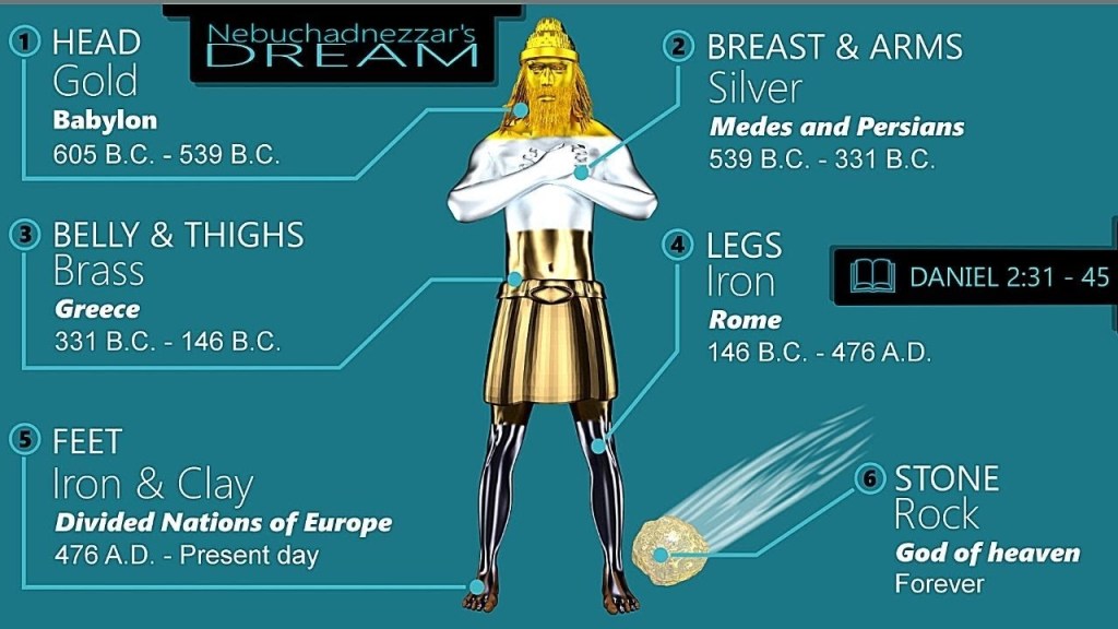 2:36-45 夢的解釋。與巴比倫的智者不同,但以理能夠揭示夢的內容和解釋。雕像的不同部分代表著不同王國,這些王國相互繼承。除了金頭之外,但以理並沒有說出雕像各部分所代表的王國的名稱,對它們的身分也有不同的看法。一些解釋者認為,這個序列首先代表巴比倫帝國(金頭),其次是瑪代波斯帝國(銀的胸膛和手臂),希臘帝國(銅的腹部和大腿),然後是羅馬帝國(鐵的腿)。其他人認為巴比倫之後的順序是瑪代人、波斯人,最後是希臘人。很有可能,甚或有一些機會,雕像的這些部分並不是指具體的王國,重點是邪惡的人類王國將相互繼承,直到上帝的國度果斷地闖入。“石頭”(第34、45節)代表上帝的國度,它將摧毀並取代這些邪惡的人類國度。因此,這個夢代表了今世國度與上帝國度之間的衝突,並宣告上帝將獲得最後勝利。(BTSB)