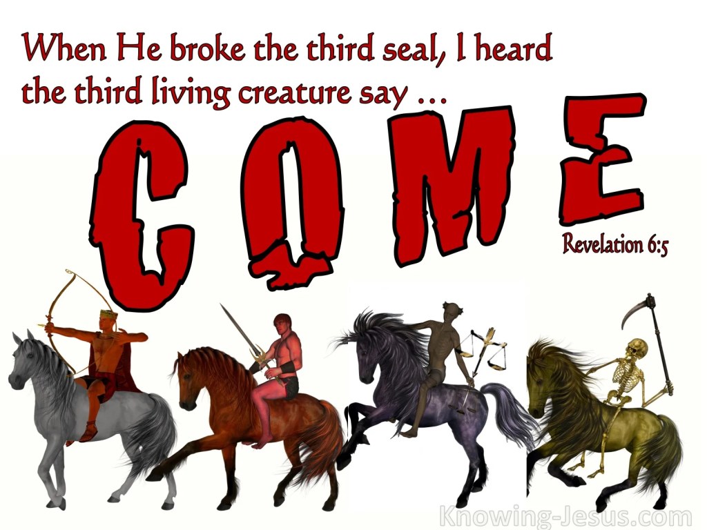 6:1-8 羔羊揭開前四印的時候,每次都有一個活物大聲說:“你來”,然後有騎士騎著馬回應活物的召喚,象徵蒙上帝差遣在遍地巡行的使者。馬的顏色與亞1:8-10和6:1-8的記載大致相同。只有在羔羊的允許和指示下,這些馬和騎士所象徵的勢力才能藉著刀劍、饑荒、瘟疫和野獸大肆殺戮。印、號和碗的審判都遵循“四加三”的模式,即四個地上的審判加三個世界性的審判。
