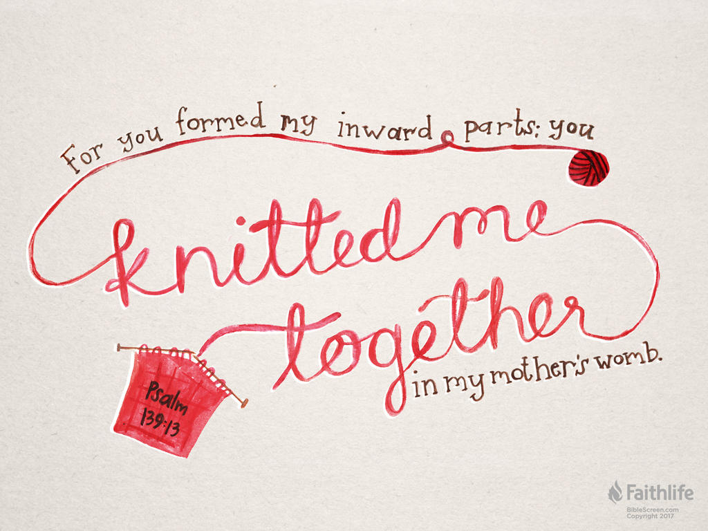 139:13-16 甚至在我出生以前,你已看到我並愛我。在希伯來原文中,本段開頭有 “因為” 一詞,表示本段與前段相關。這個詩節通過描述上帝看顧身在某個 “暗處”(母腹)的詩人,闡述11-12節的要點。在詩人未成形的體質(胎兒)生長發育期間,上帝就積極地參與;的確,是上帝塑造我的肺腑並覆庇我(《和修》“編織我”)的。在為詩人所定的日子的每一天,上帝都看見他,甚至已經將每一天都寫在上帝的冊子上了。詩人明白,甚至在他母親知道自己懷孕之前,上帝就已經開始看顧他。當他的生命在母腹中開始(見51:5注),上帝就已經為他定下生命的軌跡。