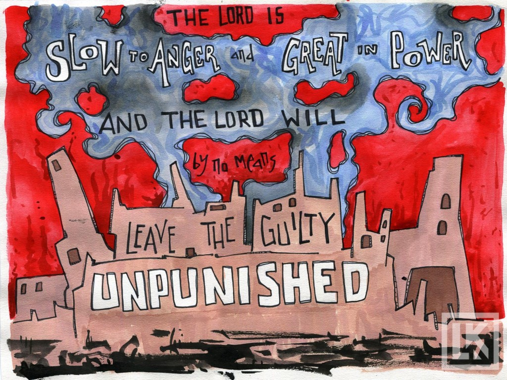 譏諷和咒詛 這幅全城傾覆的圖畫帶出向尼尼微城發出的連串譏諷和咒詛。此城昔日如同驕傲的獅子,如今卻苦無獵物(二11-13)。它被比作妓女,被捉拿並公開羞辱(三4-6)。在這兩個嘲諷的比喻中間,夾著一個咒詛的神諭(三1-3)。這個神諭源出於葬禮的場景,但此處卻完全沒有任何同情或哀傷;作用是要威嚇和咒詛。尼尼微是「死有餘辜」的。