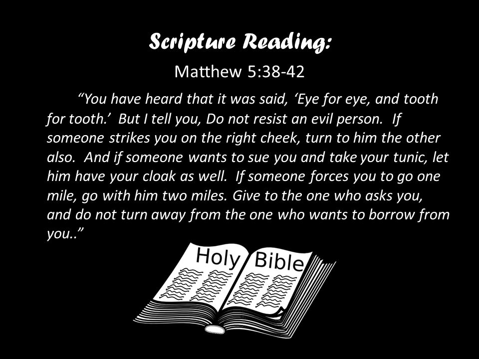 38「你們聽見有話說:『以眼還眼,以牙還牙。』 39只是我告訴你們,不要與惡人作對。有人打你的右臉,連左臉也轉過來由他打; 40有人想要告你,要拿你的裏衣,連外衣也由他拿去; 41有人強逼你走一里路,你就同他走二里; 42有求你的,就給他;有向你借貸的,不可推辭。」(太5:38-42)