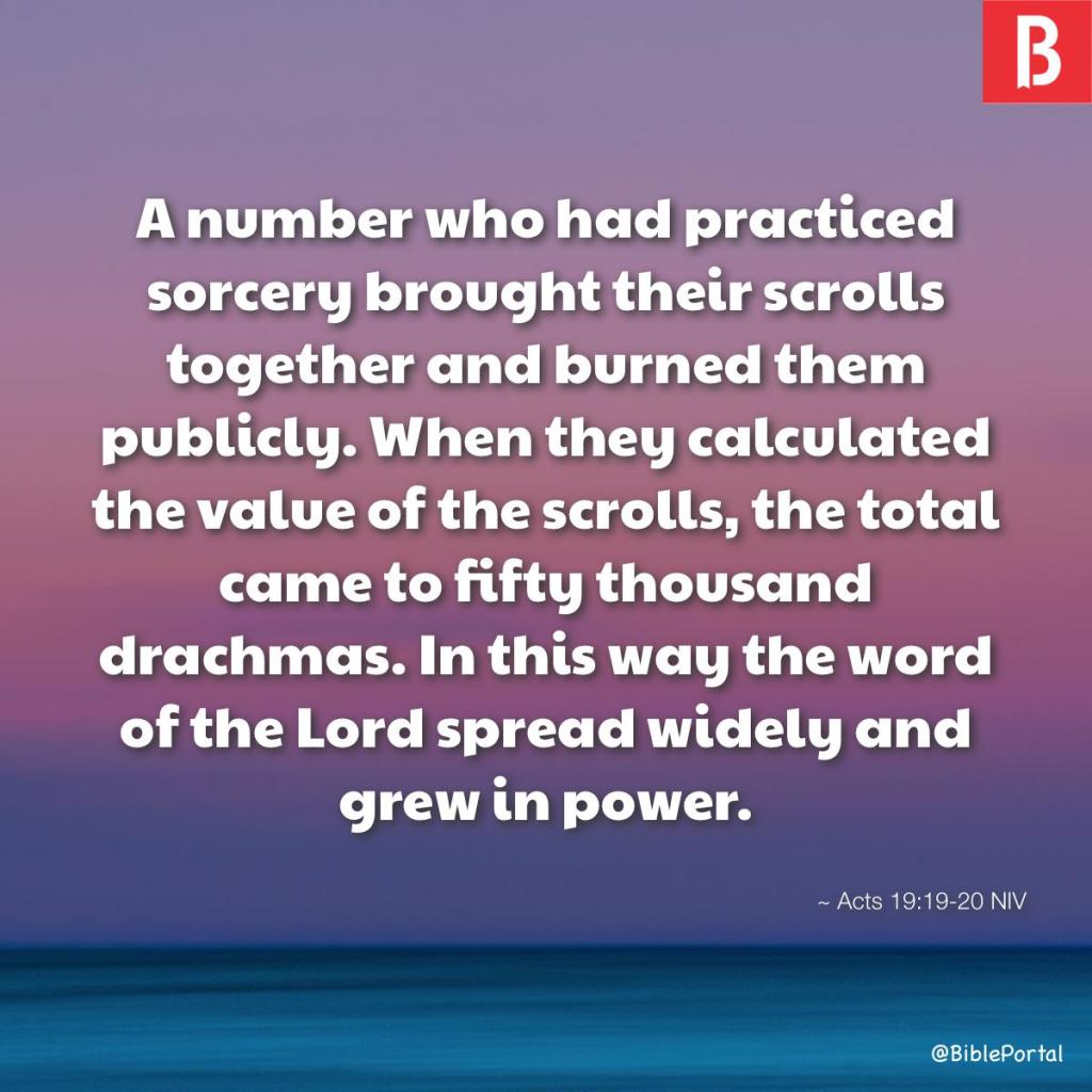 「他們都懼怕,主耶穌的名從此就尊大了。那已經信的,多有人來承認訴說自己所行的事。 19平素行邪術的,也有許多人把書拿來,堆積在眾人面前焚燒。他們算計書價,便知道共合五萬塊錢。」
