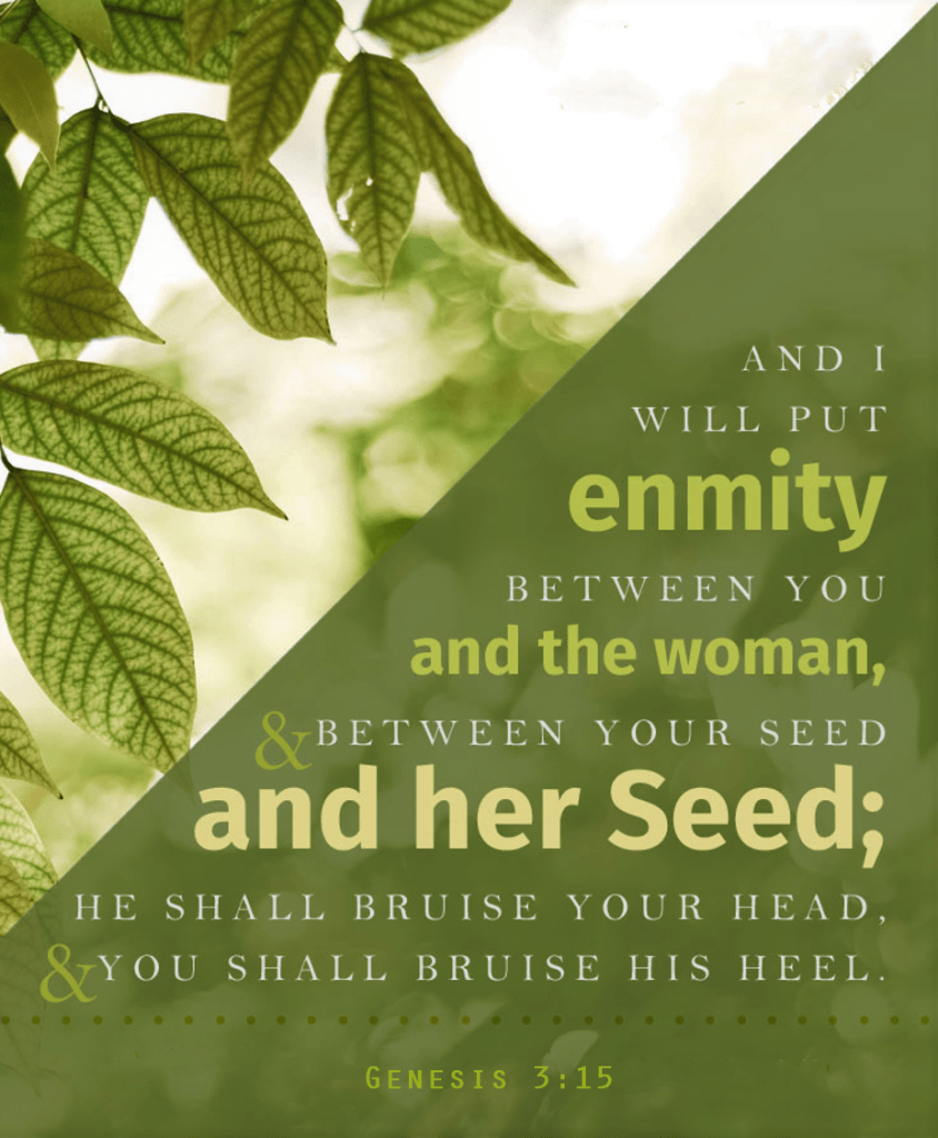 除了約翰福音三章16節之外,聖經中再沒有比創世記三章15節更關鍵、更確切的經文了:「我又要叫你和女人彼此為仇;你的後裔和女人的後裔也彼此為仇。女人的後裔要傷你的頭;你要傷他的腳跟」。正如莫德(Alec Motyer)所寫:「全部聖經並非包含在每一句經文中,但我們可以預期每一句經文都能為全部聖經作準備並騰出空間。這就是在創世記三章15節裏所發生的情況。」(注1)。有幾個重要的問題同時浮現: